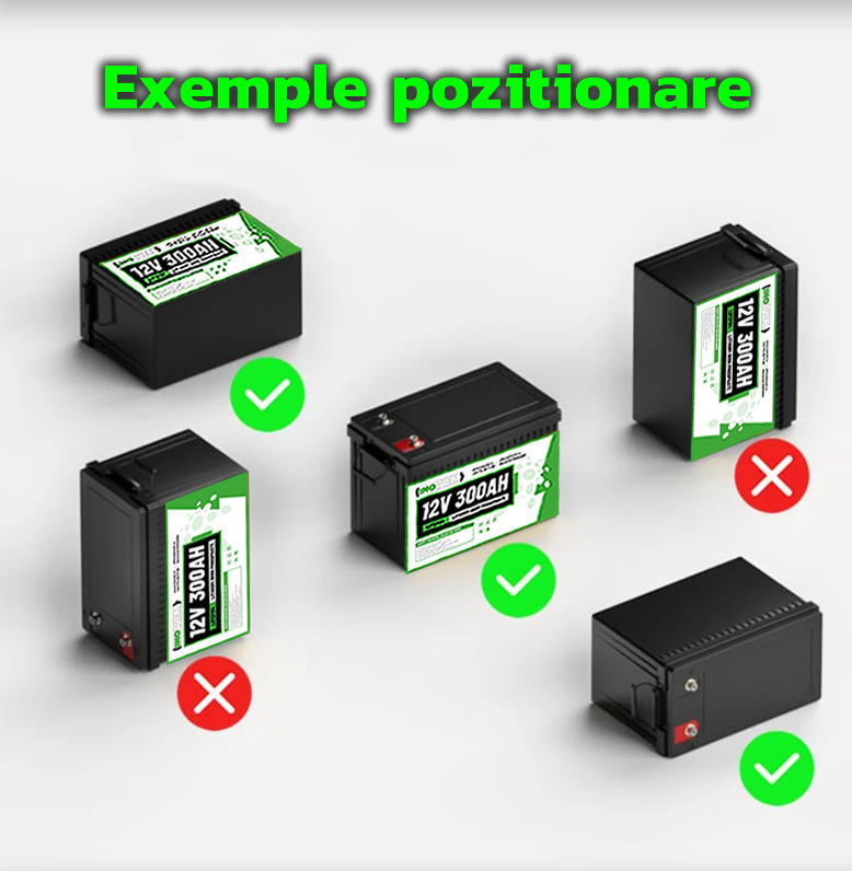 Poziționările corecte includ așezarea bateriei în poziție orizontală sau culcată pe una dintre laterale. Este interzisă așezarea bateriei pe capăt sau în poziție verticală, deoarece acest lucru poate afecta funcționarea internă a celulelor și sistemului de management al bateriei (BMS).